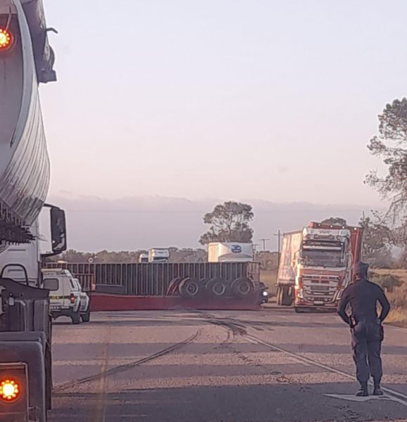 KAROO NUUS - 'n Agtienwiel-vragmotor het vanoggend, Vrydag 8 Desember, om 6:45 omgeval by Nanaga, op die N10, in die rigting van Kinkelbos, die pad verlaat en omgeval. Nanaga is ñ afrit tussen Gqeberha en Paterson.
