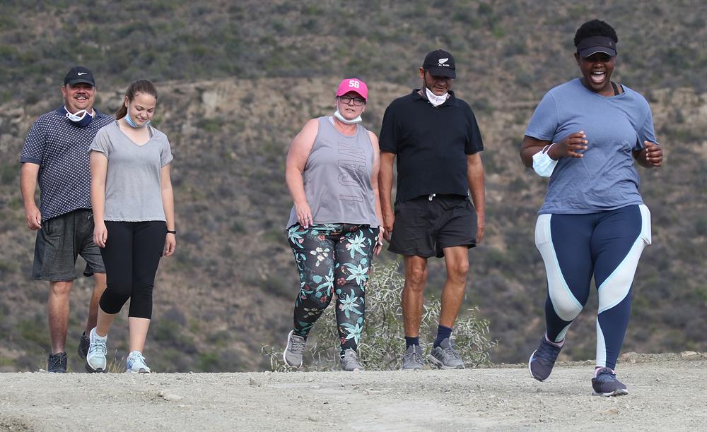 All smiles from these five regular parkrunnes as they approach the halfway mark.